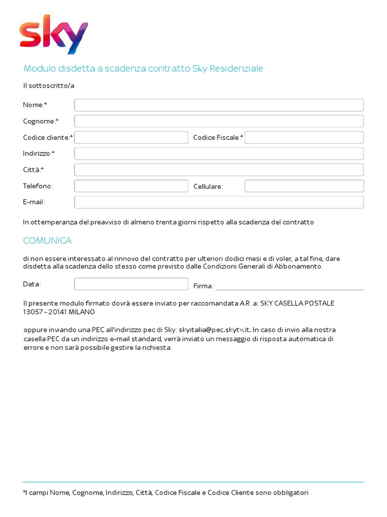 Modulo disdetta Sky PDF | Salvatore Aranzulla Per scaricare il modulo di disdetta Sky in formato PDF, recati su questa pagina del sito di Sky, individua la sezione Recesso entro 14 giorni (in fondo) e clicca sull'icona della freccia rivolta verso il basso, posta in corrispondenza del modulo di tuo interesse, in base al contratto che vuoi disdire (es. Disdetta Sky: modulo PDF, come fare, lettera indirizzo In questa guida completa sulla disdetta Sky ti spiego come fare, ti indico l'indirizzo a cui spedire la raccomandata oppure l'indirizzo PEC se vuoi farlo via email, il modulo da inviare in caso di decesso del titolare dell'abbonamento, i tempi e i costi di disattivazione ed infine come usufruire delle cosiddette "controfferte" Sky. Indice Come fare